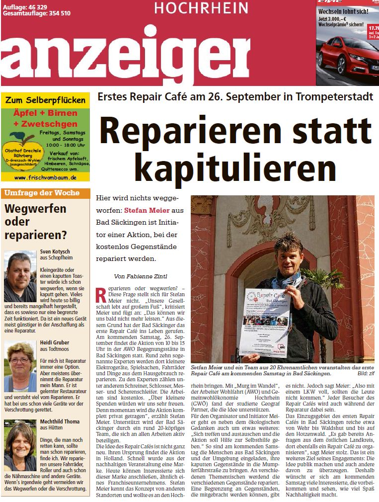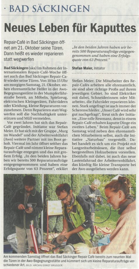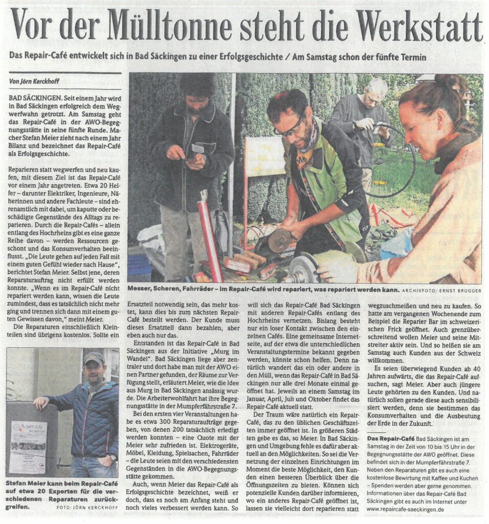 Das Repaircafé Bad Säckingen erntet nicht nur positive Resonanz von den lokalen Medien, sondern schafft es, die Botschaft von Nachhaltigkeit und Gemeinschaft weit über die Region hinaus zu tragen. Mit jeder reparierten Lampe, jedem geflickten Fahrrad und jedem geteilten Handgriff setzen die engagierten Teilnehmer ein Zeichen für eine nachhaltigere Zukunft.